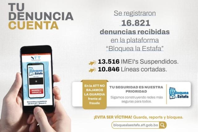 La ATT reiteró el llamado a la ciudadanía a verificar la autenticidad de los mensajes antes de efectuar cualquier transacción o donación, no compartir información personal ni códigos de confirmación con personas desconocidas y denunciar cualquier intento de estafa a través de la plataforma https://bloquealaestafa.att.gob.bo/ o llamando a la línea gratuita 800-10-6000.