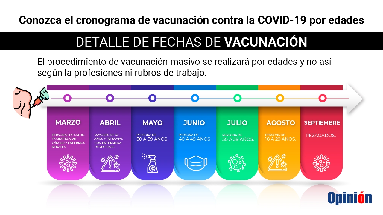 Según los datos preliminares, en marzo se vacunará a personal de salud, pacientes con cáncer y renales; en abril a personas mayores de 60 años y personas con enfermedades de base; en mayo, las personas entre 50 y 59 años.